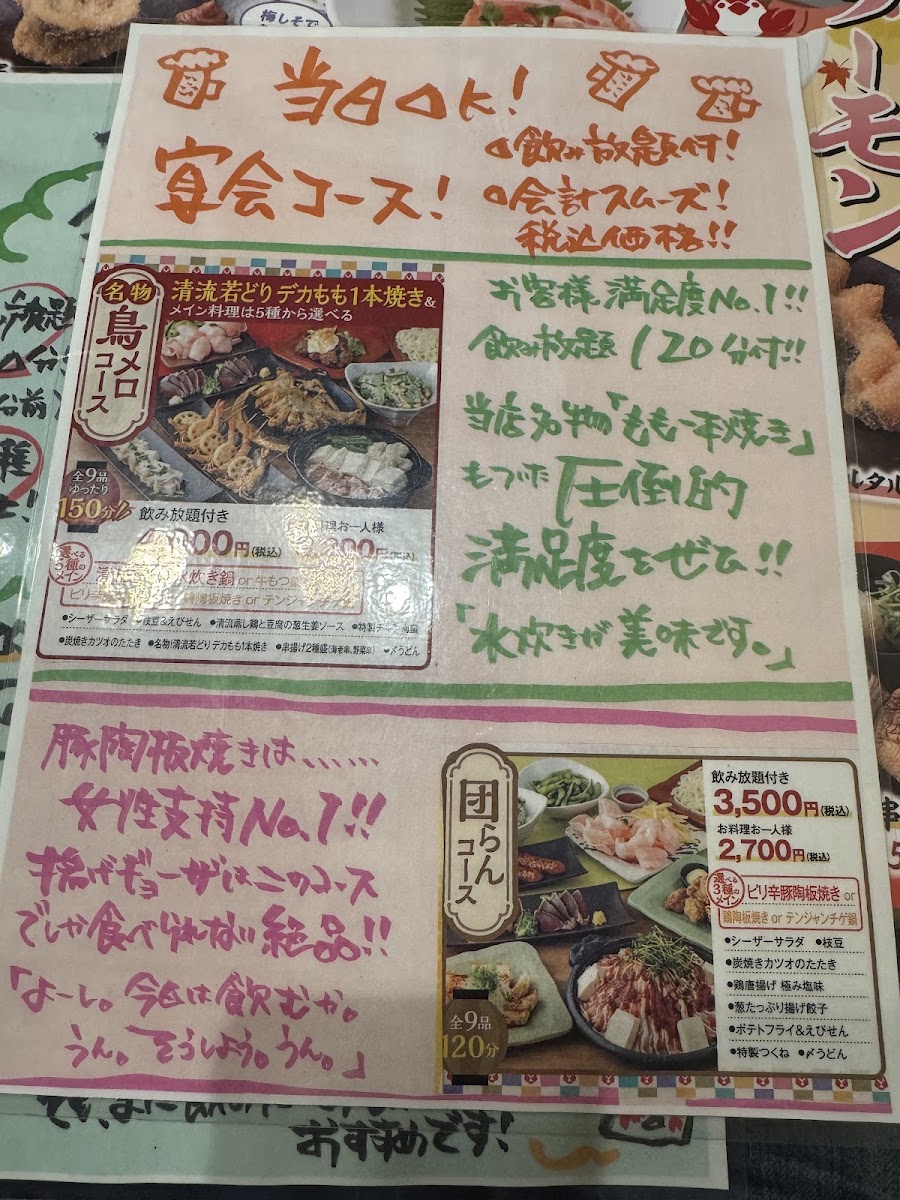 ゆったり2.5時間の飲み放題が付いたコースです。メインのお料理は「みちのく清流若どりの水炊き鍋」♪清流若どりのデカもも串も入った、鳥メロを堪能できる人気のコースです!!お鍋はテンジャンチゲ鍋・牛もつ鍋・ピリ辛豚陶板焼き・鶏陶板焼きに変更可能!変更ご希望あれば備考に記載お願いいたします。変更の希望が無い場合「水炊き鍋」で提供致します。